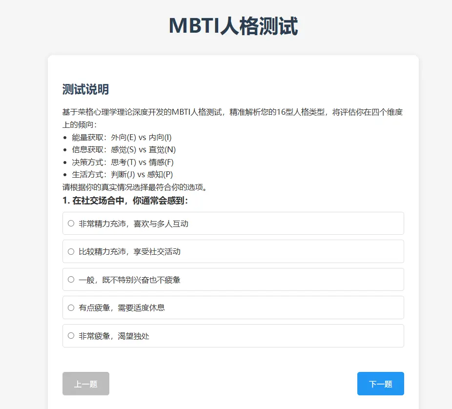 MBTI人格测试,基于荣格心理学理论深度开发的MBTI人格测试,精准解析您的16型人格类型,将评估你在四个维度上的倾向:能量获取:外向(E) vs 内向(I)、信息获取:感觉(S) vs 直觉(N)、决策方式:思考(T) vs 情感(F)、生活方式:判断(J) vs 感知(P),从而做出一系列分析。